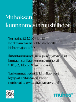 Muhoksen kunnanmestaruushiihdot Korkalanvaarassa torstaina 12.3.2026. Ilmoittautumiset (nimi ja syntymävuosi) kuntaan sari.laakkonen@muhos.fi tai 10.3. klo 15.00 mennessä. Kilpailupaikka Korkalanvaaran hiihtostadion, Hiihtomajantie 30. Hiihtotapa vapaa. Numeroiden jako klo 17.45 stadionin ajanottotornilla. Ole ajoissa paikalla, jotta ehdit tutustua rataan etukäteen. Ensimmäinen lähtö klo 18.00 pienimmistä alkaen. Väliaikalähdöt 30 sek. välein. Sarjat: