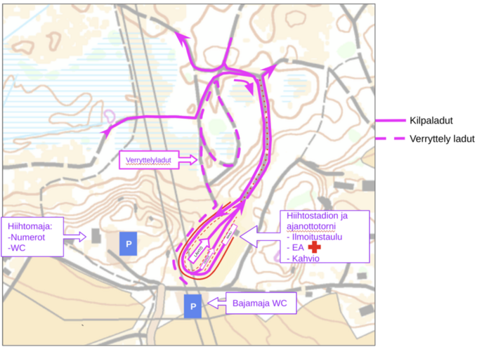 Paikoitus hiihtomajan parkkipaikalle, stadionin parkkipaikalle sekä tienvarsi paikoitusta. Tiet on pidettävä avoinna alueen asukkaille sekä tarvittaessa pelastushenkilökunnalle! Noudata liikenteenohjaajien ohjeita!