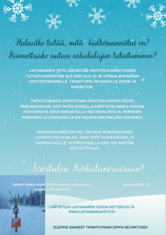 Hiihtosuunnistuksen tutustumispäivä 16.2.2025 Korkalanvaaran hiihtostadionilla. Tervetuloa!