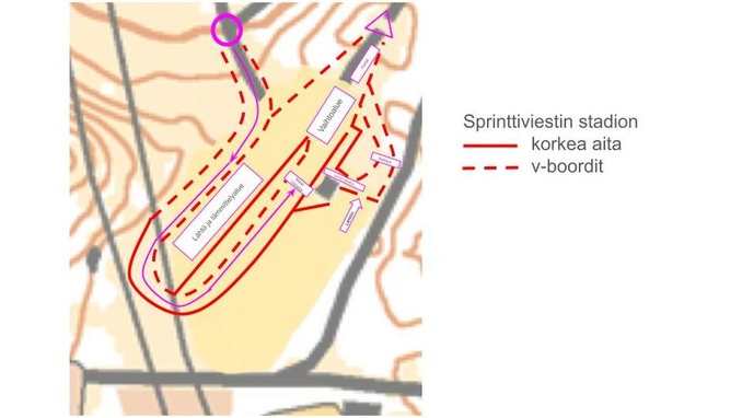 Sprintin lähtöpaikka (molemmat osiot) sijaitsee 400 m päässä hiihtostadionilta. Reitti lähtöön on merkattu. HUOM! Varo kilpailevia suunnistajia lähtöön mennessä, reitti lähtöön kulkee “yleisörastin” vierestä.